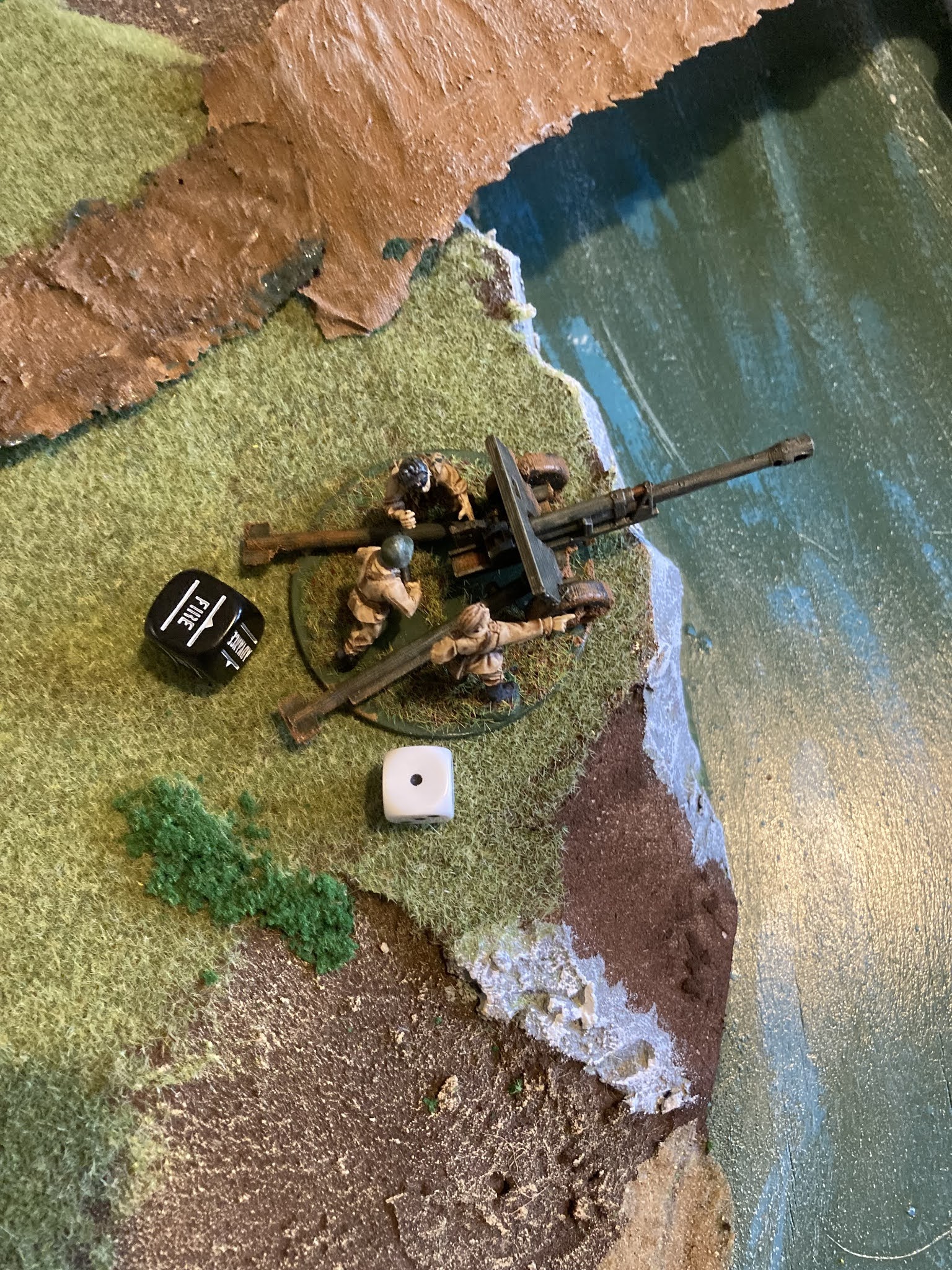 Post-mortem. A bit of a litany of errors on my part I think. In force selection I totally failed to learn from the very clear lesson of last time and give my Veterans who would have to hold the objectives AT grenades. The logic of giving LMGs to generate a few pins was sound but didn’t outweigh the opportunity presented by enabling them to take on the German armour – given the requirement for the Wehrmacht to come to the objective these sections should have stayed hidden in the river bed until they could assault out with satchel charges and pointy sticks at anything trying to secure the objective. Deployment of my initial force was sound; however, I let things get away from me. The decision to bring my reinforcements on from the east behind the Axis armour was sound but it should have been obvious to me from the beginning that I could make a trap for the Axis reinforcement by forcing him on from the west into fire from the Zis-3 (which could have gone on ambush rather than turning round) and the western T-34 who could have stayed hull down on the river bank. The threat to my Zis-3 from the advancing Grenadiers was already negated by the movement of one of my Tank Rider sections. They could have easily shielded the bridge from the cover of the rocks – if they were supported by a living T-34. By advancing the T-34 to try and hit the Grenadiers on Turn 1&2 if offered up my tank flank for no critical advantage. On balance I think this scenario is stacked in favour of the defender and I kind of blew it…